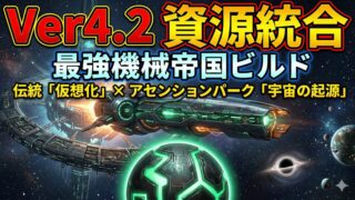 Stellaris(ステラリス)Ver 4.2環境において、機械知性専用の起源「資源統合」と、爆発的な内政バフを誇るアセンションパス「仮想化」、そして圧倒的な技術力と艦隊出力を得られる危機パーク「宇宙の起源」を組み合わせた、現環境最強クラス...