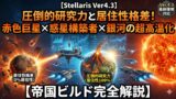 今回は、Stellaris Ver4.3環境において、わずか3つの惑星でありながら、月間研究力2000、合金500以上を叩き出す驚異的な内政特化ビルドをご紹介します。このビルドは起源「人工生命の生殖本能」を活用し、職業の産出効率を限界まで高めることに特化しています。序盤の厳しい人口減少を乗り越えれば、中盤以降は圧倒的な技術力と経済力で銀河を支配することが可能です。