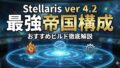 最新のStellaris 4.2環境では、「人工生命体の豊穣」などの強力な起源のナーフが目立ったものの、依然として第一線で活躍できるポテンシャルを秘めています。また、大出世を果たした「地底生まれ」や、新DLCの「宇宙の黎明」「赤色巨星」など、新しいビルドを試すには最高の環境が整っています。